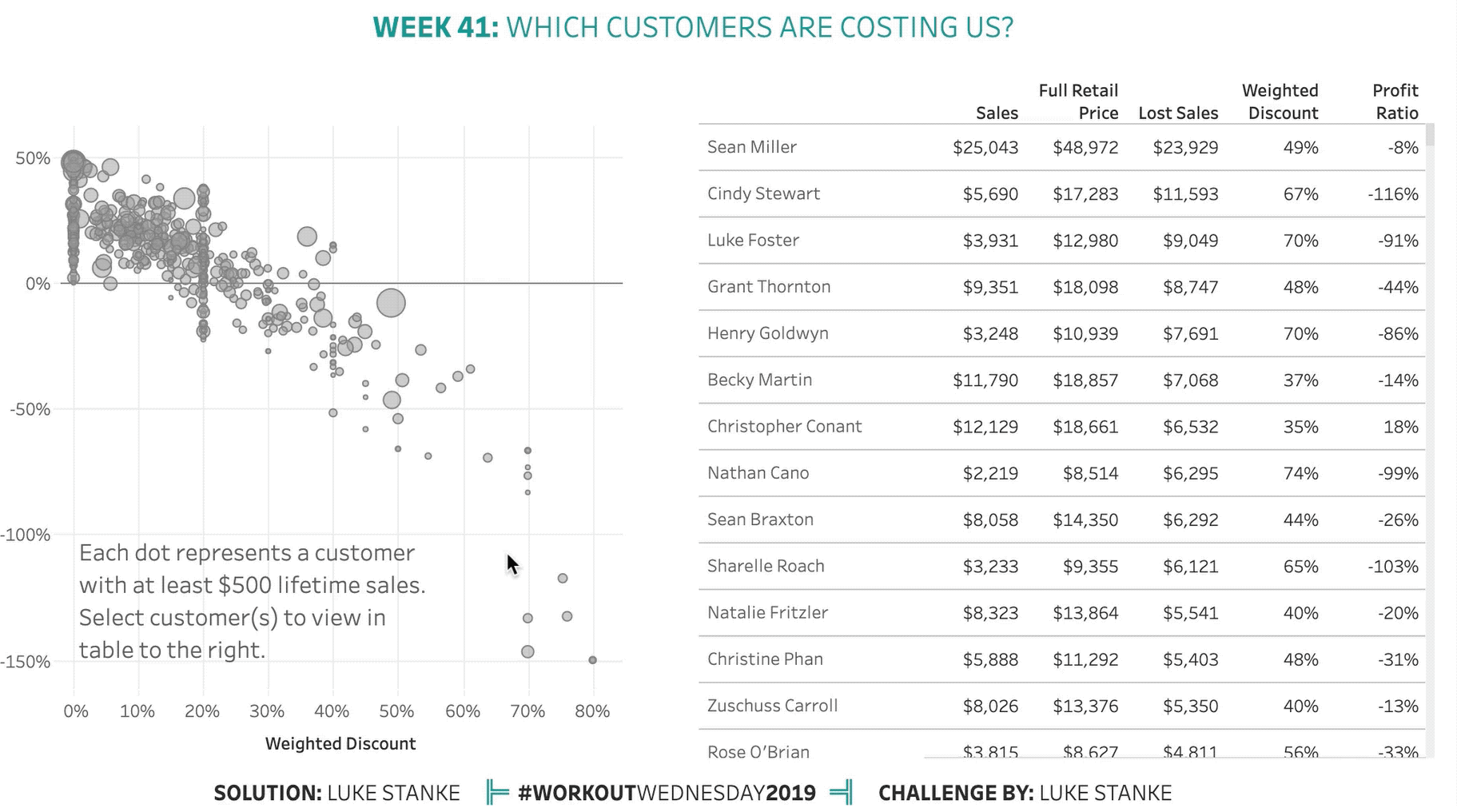 Hi Luke – I have a question. When I click on Sharelle Roach in the scatter plot (lower right ~70% weighted discount), the tooltip says $2,550 sales, 70% discount and -133% profit ratio. The numbers are different from the table which says $3,233 sales, 65% discount and -103% profit ratio. Should it be the same?