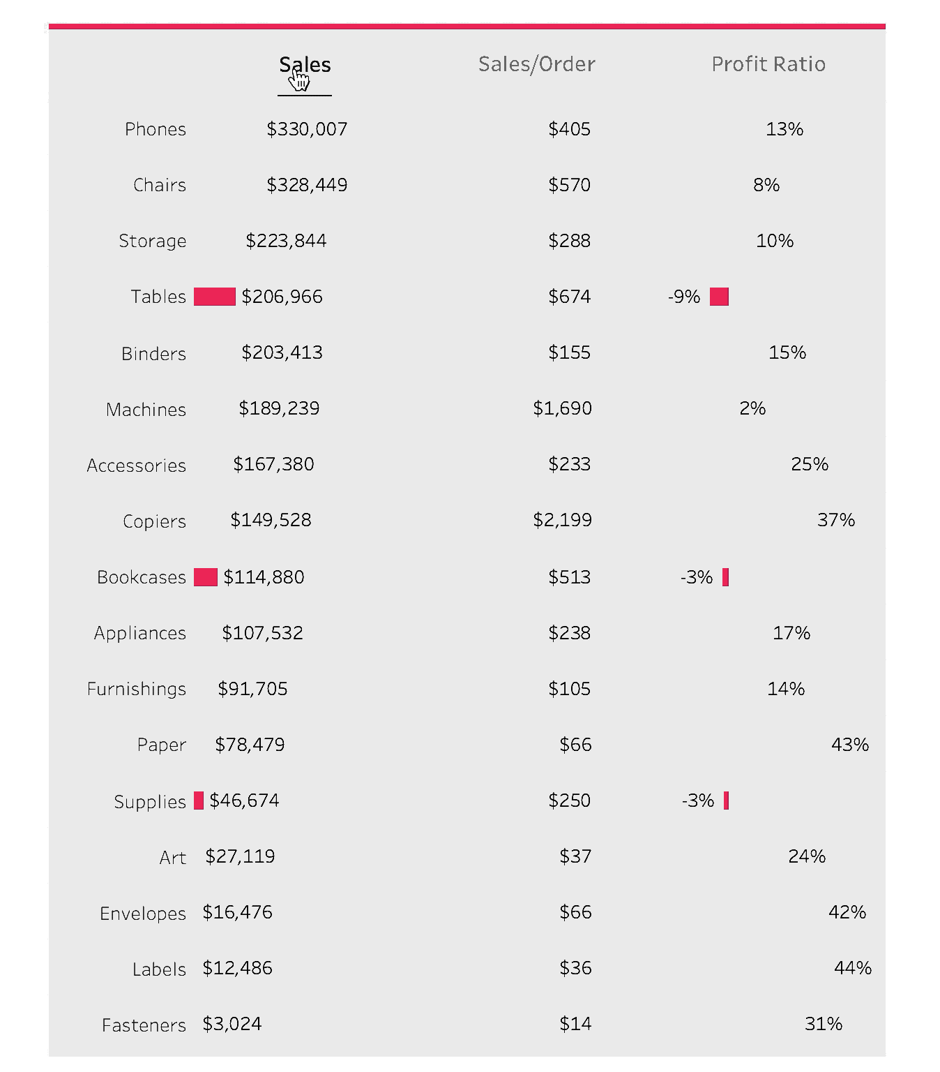 - Color the bars Ruby Red (#D81159) if the sub-category has a profit ratio that is negative and gray if it is positive.
