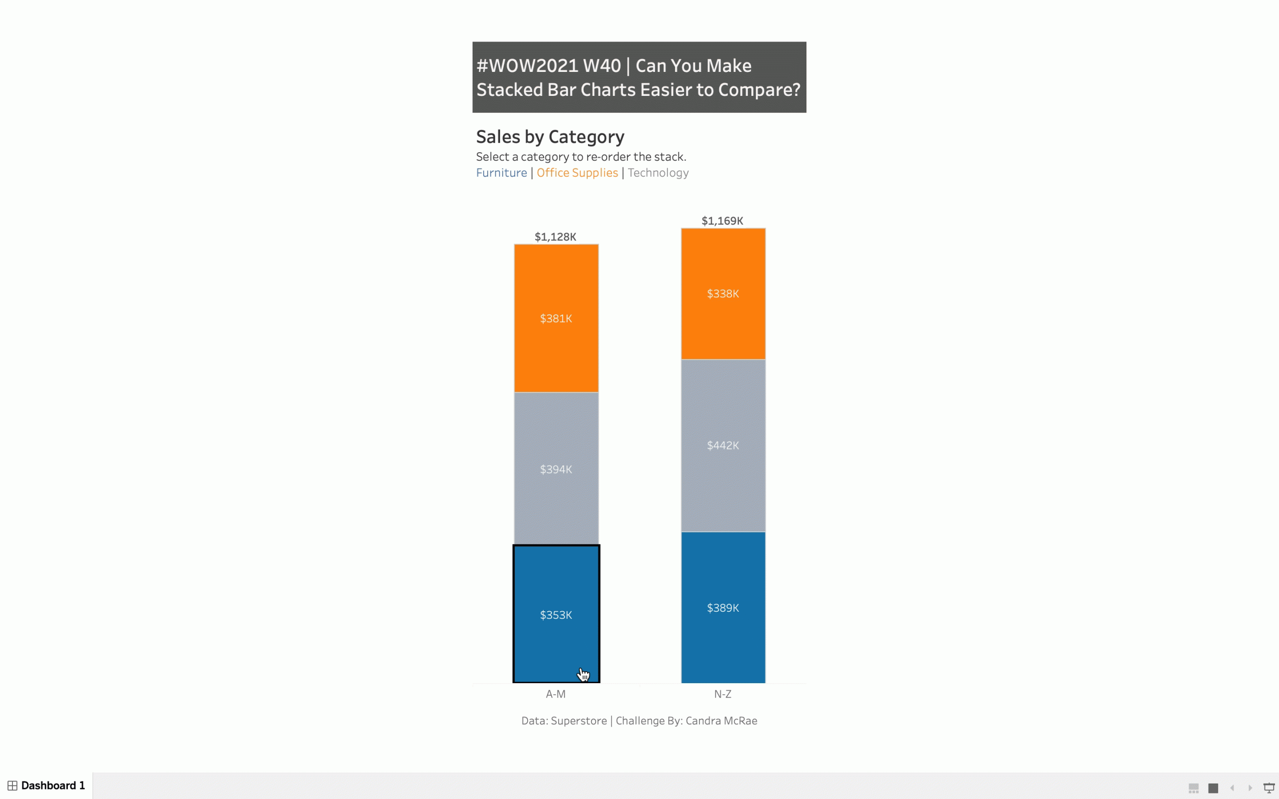 - Create a vertical stacked bar chart (sales by category) that switches the selected category to the bottom