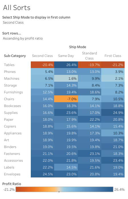 - The columns should be sorted by the ship mode selected in the drop down first, followed by the remaining ship modes. The remaining ship modes are also sorted descending by their overall profit ratio. For example if you select Same Day in the drop down, Same Day should appear as the left most column, followed by Standard Class (13.1% profit ratio overall), Second Class (12.0% profit ratio overall) and First Class (11.3% profit ratio overall). I’ve put an image below of the Ship Modes profit ratios so you can check.