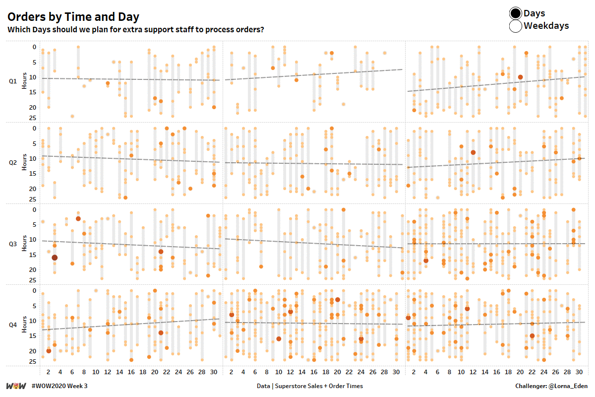 This week, I wanted to take a look at how people could visualise time in a unique way. My idea around this is planning. Looking at time in this manner allows people to look at workload / order load etc and see where was most and least popular, which will allow planning for the workforce or other elements.