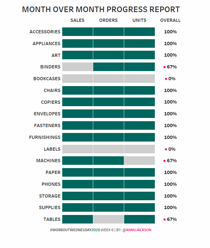 You’ll be making a Month over Month Progress Report that shows the health of Sales, Orders, and Units sold by Sub-Category.  I’ve simplified it for the challenge, but you can imagine a real world where each of these boxes could be colored based on different measures of success.
