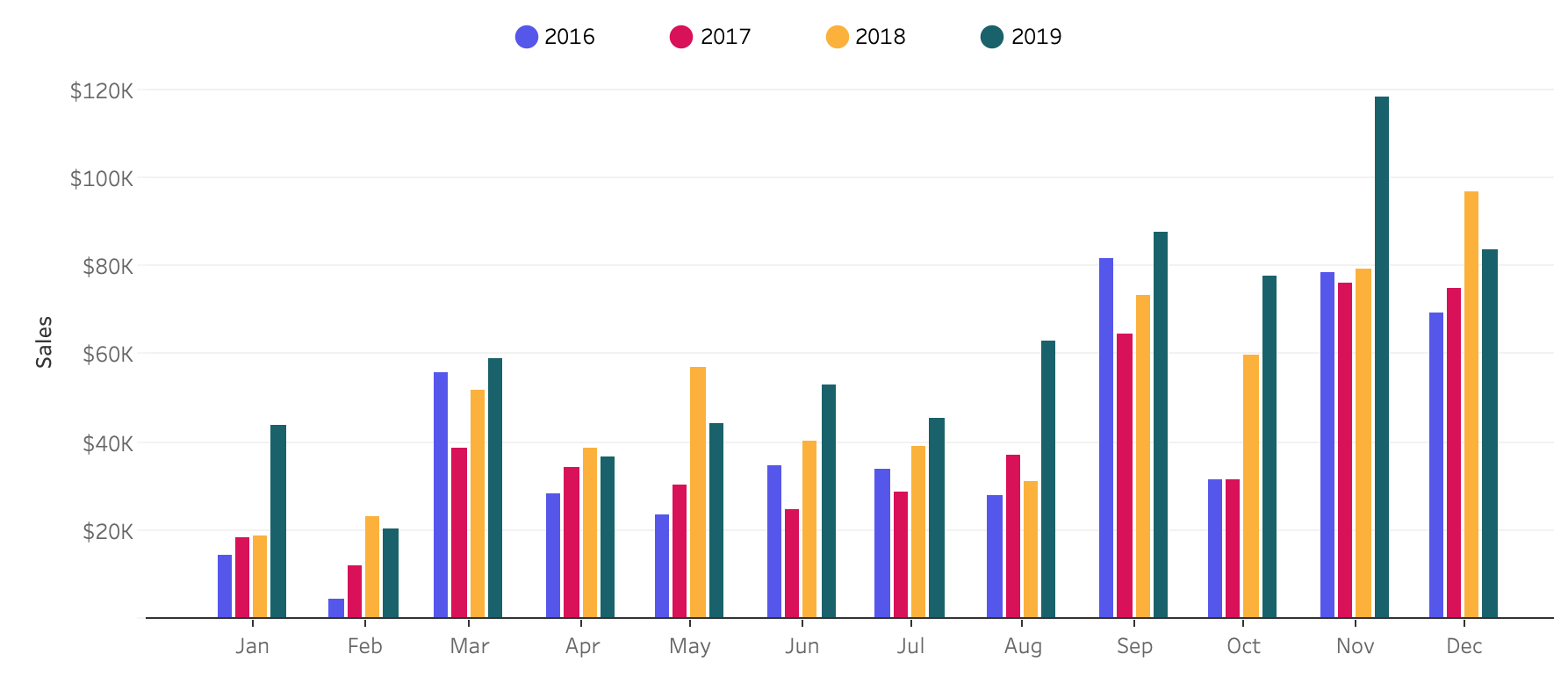 This week’s challenge is relatively straight-foward: remake a bar chart to look like a Microsoft Excel bar chart. The key to this chart is the extra whitespace between months.