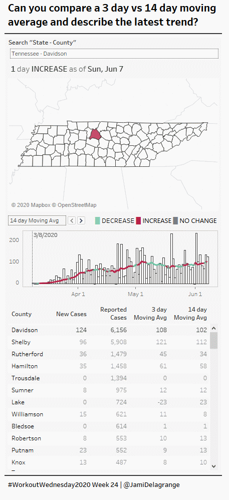 To support the ask, Jami did some research and found a few remarkable resources on the Tableau COVID-19 hub and also some compelling community examples. One visualization stuck out to her, and it formed the basis for our challenge this week: a map by Christian Felix showing by county whether the 3 day moving average of COVID cases was above the 14 day moving average number of COVID cases, indicating either an increase or decrease, and also computing the length of the subsequent trend (eg: decreasing for X days).