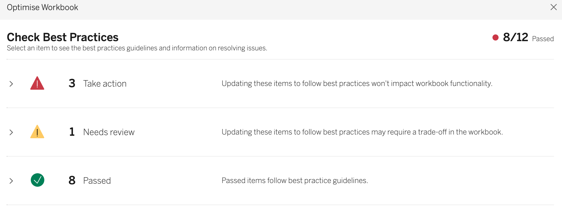 For this week I wanted to focus on a recently release feature. The workbook Optimizer. You will need to use 2022.1. It will give you a list of actions to take to make the workbook better. See if you can make this workbook pass all 12 actions!