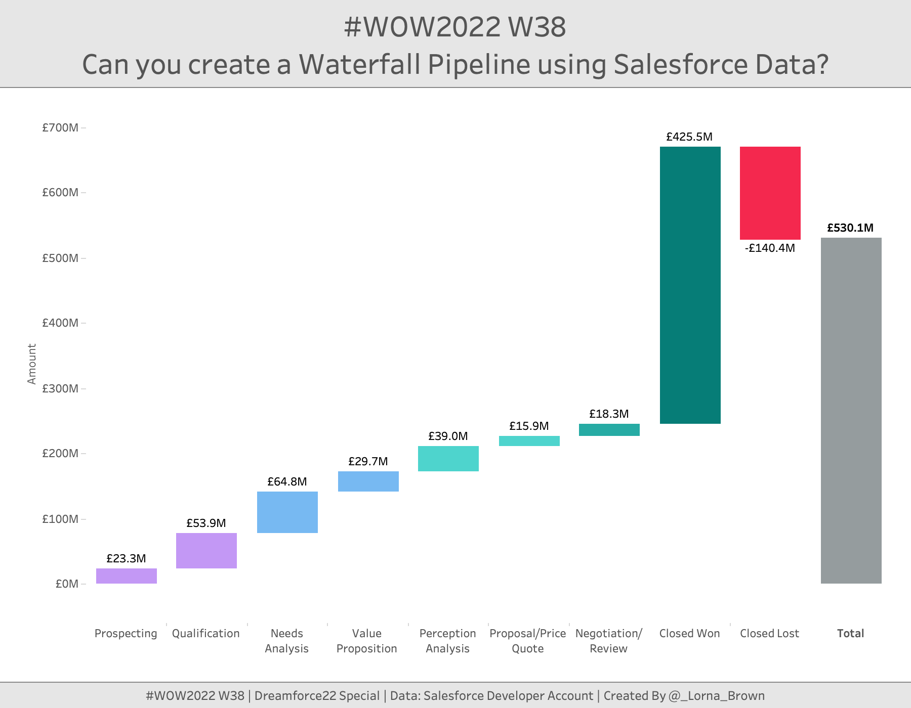 This week is Dreamforce; Salesforce’s conference. So I thought I would stay on theme and use Salesforce Data. When I first started to see Salesforce pre-built dashboards they included several elements, but the one we are going to focus on today is the Waterfall chart. This allows us to see how much value is within each stage of the opportunity lifecycle.