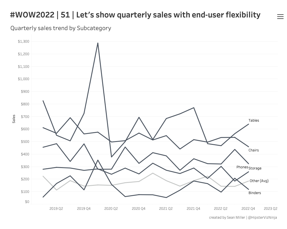 “Sure! No problem” you say because why would you turn down a challenge? But then you start building it and you realize that these dimensions have a hard cardinality so the trends turn into a plate of spaghetti. This is obviously not ideal so you have to get creative – and this is what I end up building to satisfy the request.