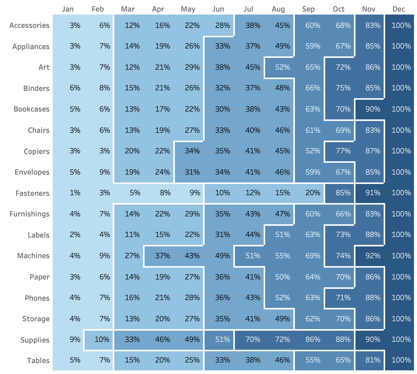 • For each cell of the heat map show the cumulative percent of total sales for each sub-category (the values should only count up–unless there are returns)
