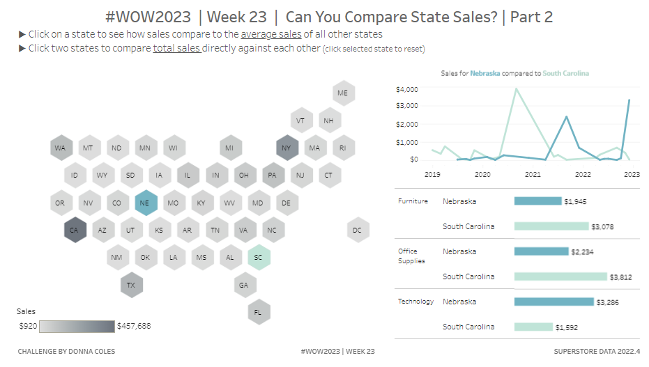 A few weeks back, in week 11, I set this challenge to build a viz that allows the comparison of state sales. I indicated at the time that it was part 1, so this week is part 2 and we’re going to expand on the requirements.