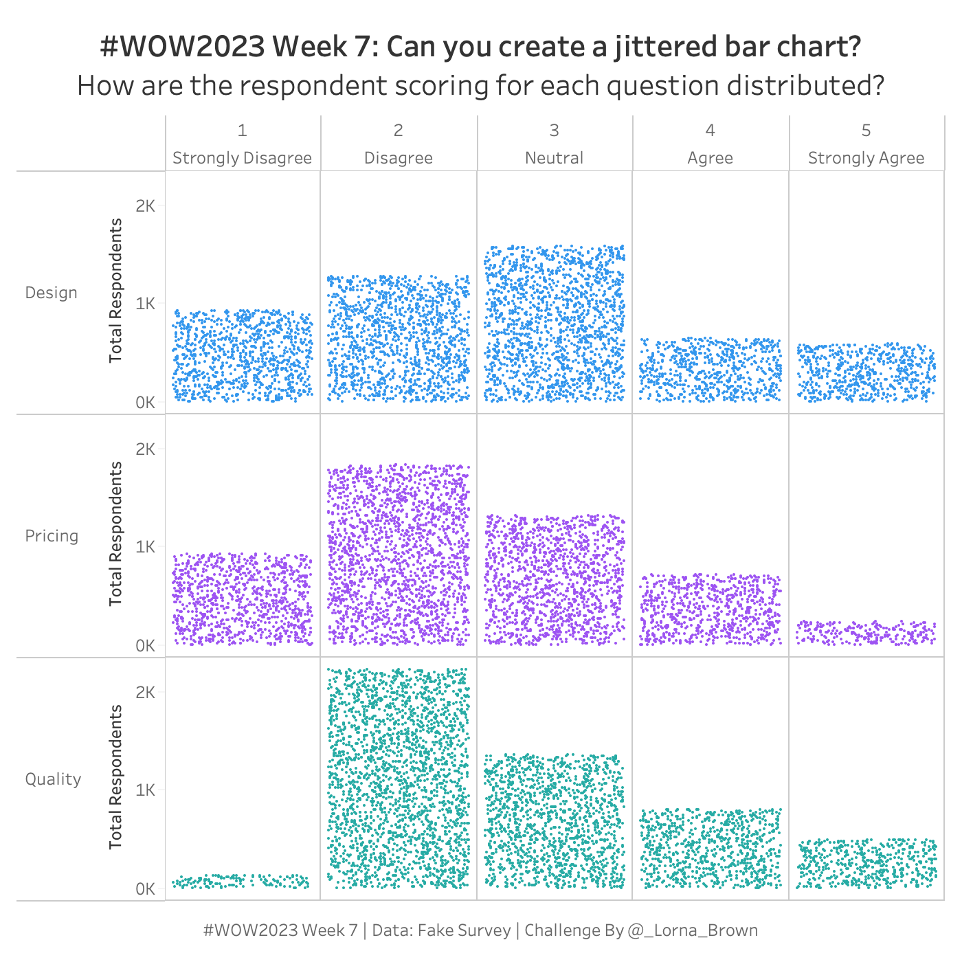 - Create a jittered bar chart showing the number of respondents per question, per category per answer