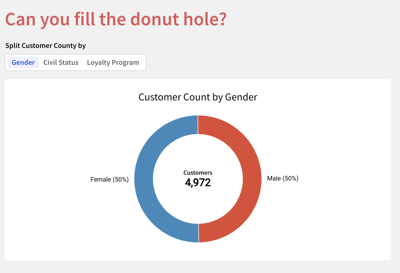 - Create a donut chart showing the total count of customers and a breakout by Gender, Civil Status, and if they are part of the customer loyalty program