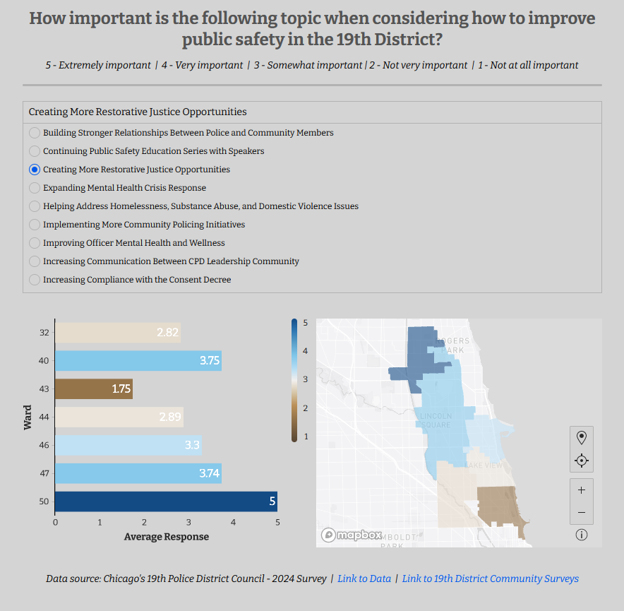 A few weeks ago, the 19th Police District of Chicago emailed me with some interesting survey data. The visualizations were useful, but they were living inside of a Google Slides presentation, and I wanted to dig deeper into the results. Thankfully, I followed my nose to their community survey website and found that they shared the raw (de-identified) data publicly!