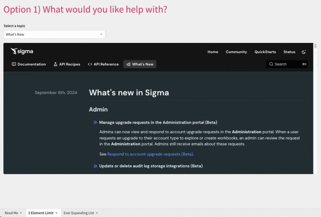 Imagine you’re creating a workbook showing off all the cool features and functionalities to your coworkers and want to provide a curated list of Sigma’s help documentation. In this challenge, you’ll create an embedded documentation element enabling the end users to choose a topic and see the documentation right there!