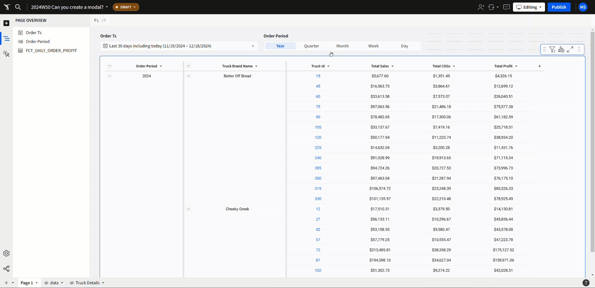 - Truck ID with total sales, total COGs, total Profit – calculated and formatted appropriately