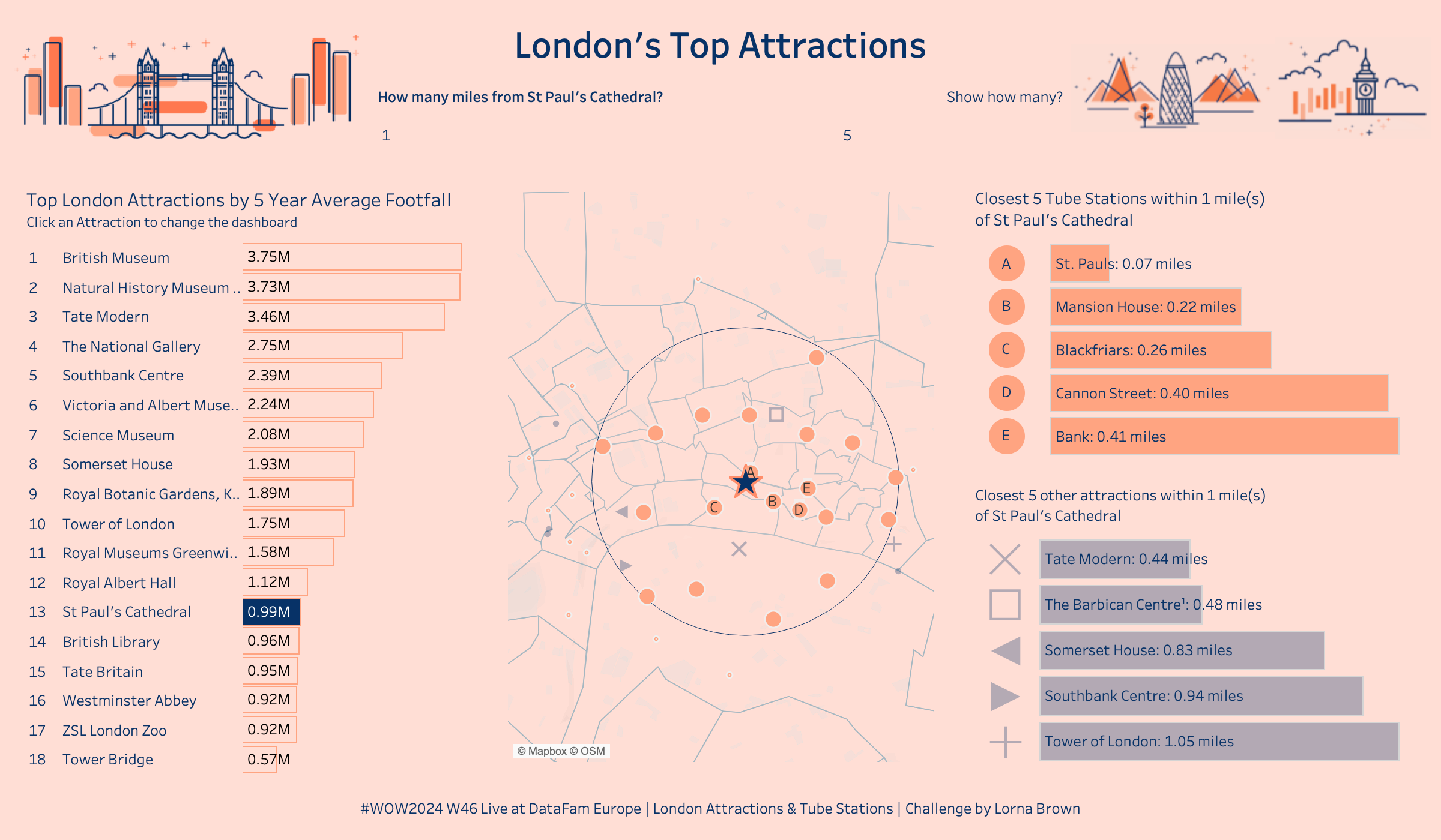 - Tube Stations & Other Attractions within X * 1.5 miles of Selected Attraction