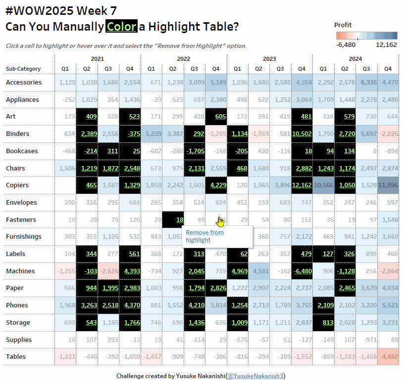 This week’s theme is highlight tables. They build on crosstabs by adding visual emphasis through color, making it easier to spot patterns and trends, which makes them an effective chart type. Since they feel like a natural extension of Excel, many people learn about them early when starting with Tableau.