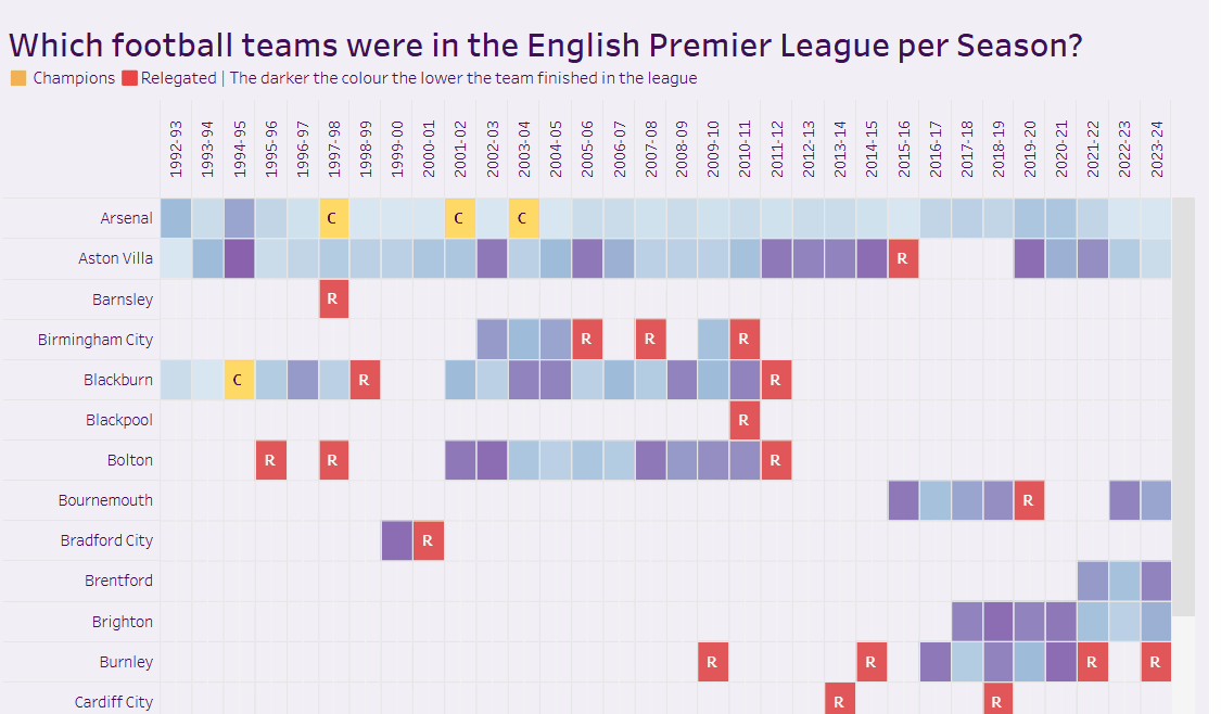 - Build a tabular display depicting Team by Season, where each cell is coloured if the team is in the EPL for that season.