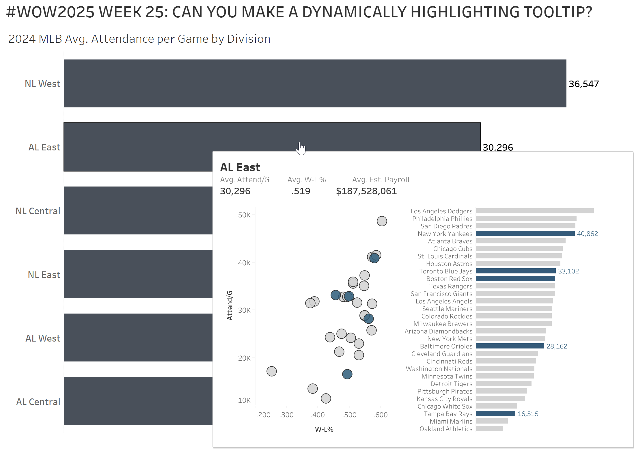 - Add those vizzes to the tooltip of the first bar chart, so that hovering on a Division bar will highlight the teams from that division in the vizzes in tooltip.