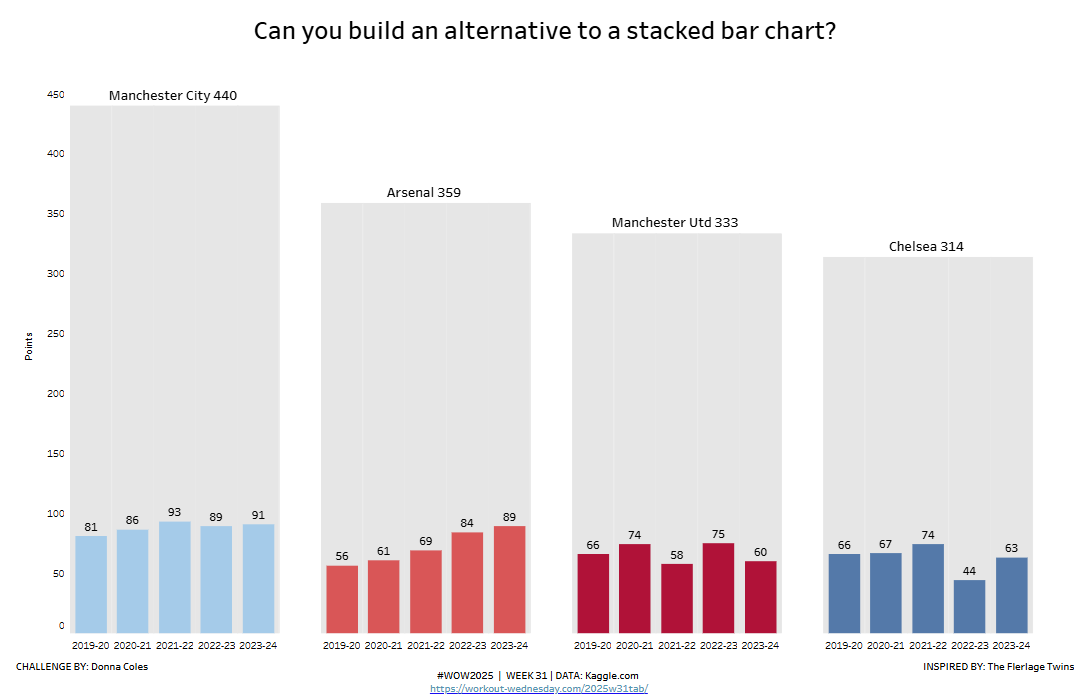 So for this week, we’re going to build an alternative to a stacked bar chart, but make use of some English Premier League data instead (a recurring theme for me this year 🙂 ).