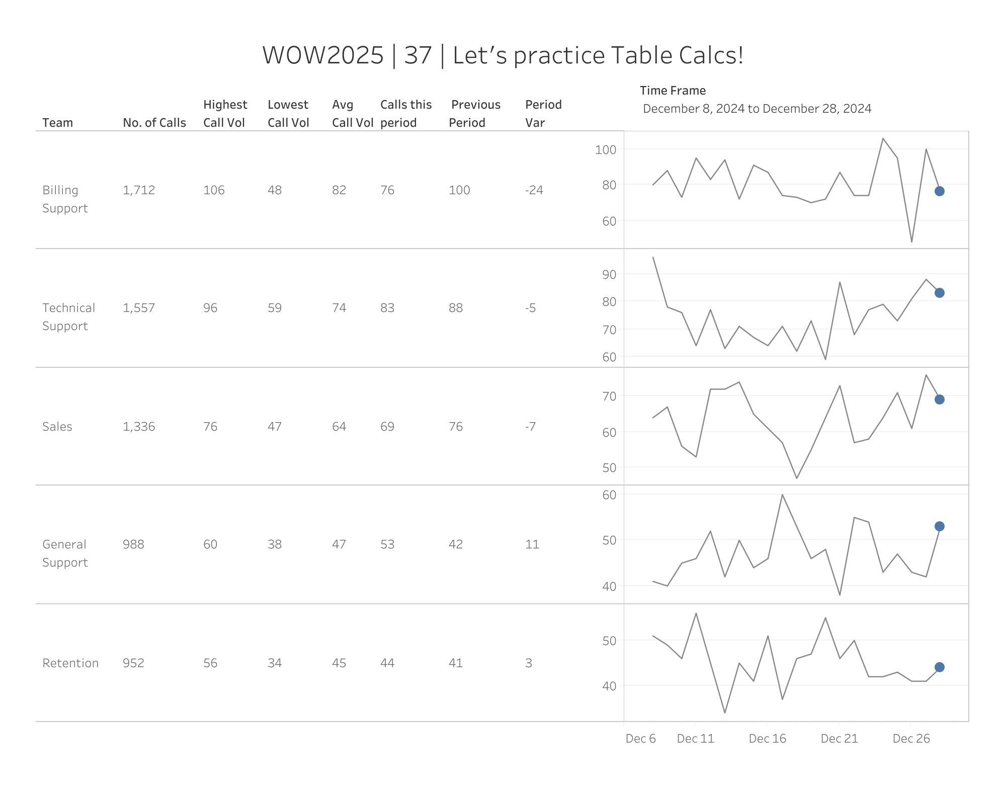 - Make a sparkline chart by team visualizing Daily Call Volume