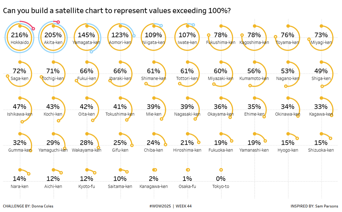 Back in Week4 of 2024, Yusuke set a similar challenge to visualise donuts exceeding 100% through use of colour (https://doncol80.dreamhosters.com/2024w04tab). I figured I’d use the same data to produce the satellite chart instead.