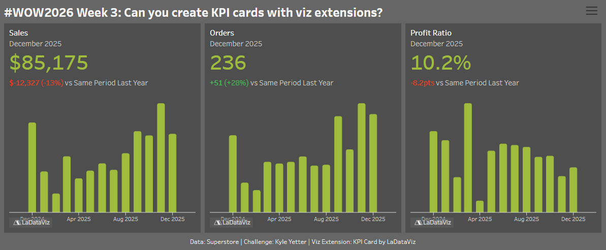 - Create 3 KPI cards using the KPI Card extension from LaDataViz. You choose the metrics, comparison period, formatting. This is the key piece of the challenge…experiment, try the different settings, play with the format, find out what’s possible