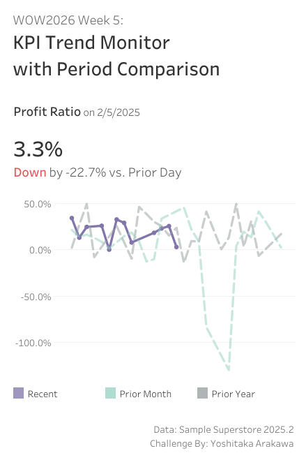 Thanks to tools like Tableau MCP, AI can now handle deep-dive data analysis for us. Ask it “why is this metric dropping?” and you’ll get a pretty solid answer. But before that step — noticing that something looks off in the first place — that’s still on us, looking at a dashboard. This week, let’s build a dashboard that helps you quickly spot KPI movements and think “hmm, maybe I should look into this” — a trigger for deeper analysis.