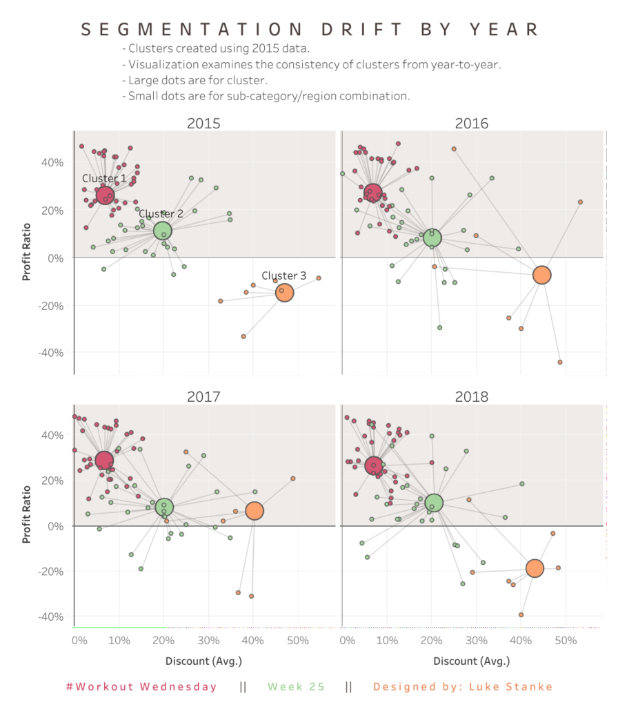 This week we start using the analytical tools — specifically clustering. Tableau’s built in cluster algorithm can be used to do customer segmentation. But instead of doing this by customer we are going to keep it simple by using sub-category and region. Intermediate click to view on Tableau Public Jedi click to view on […]