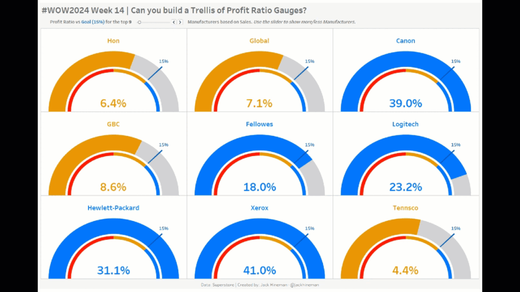#WOW2024 | Week 14 | Can you build a Trellis of Profit Ratio Gauges?