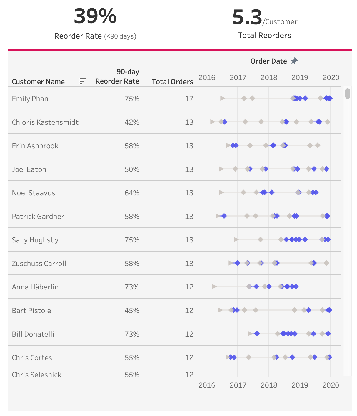 - Include a column for 90-day reorder rate. This would be the percent of orders that have occurred within 90 days of the previous order by that customer. The first order of any customer should not be included in the metric.